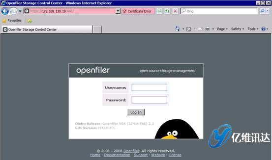 Openfiler 鏡像系統(tǒng)配置當(dāng) Openfiler 系統(tǒng)安裝并重啟完成后,對(duì)系統(tǒng)所有后續(xù)的配置過程,都是以 Web 方式配置完成的。這種全部基于 Web 的系統(tǒng)配置方式,使得配置過程變得更加簡(jiǎn)易,同時(shí)也帶來(lái)了良好的用戶體驗(yàn)。首先打開瀏覽器,輸入地址:https://IP:446。注意,此處輸入的 IP 地址為在系統(tǒng)安裝時(shí)所配置的固定 IP 地址。然后使用系統(tǒng)初始默認(rèn)的用戶名和密碼進(jìn)行登陸。用戶名為 openfiler,密碼為 password。系統(tǒng)初始的用戶名和密碼可以在第一次登入系統(tǒng)后進(jìn)行重新設(shè)置。如圖所示。