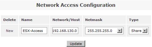 在系統(tǒng)菜單“System”菜單下的“Network Access Configuration”區(qū)域,配置允許訪問 Openfiler 系統(tǒng)的安全訪問控制列表。值得注意的是只有加入到 Openfiler 的網(wǎng)絡(luò)訪問控制列表中的網(wǎng)絡(luò)或者主機(jī)地址,才允許訪問 Openfiler 系統(tǒng)所提供的虛擬存儲(chǔ)服務(wù)。在網(wǎng)絡(luò)訪問控制列表中,既可以配置網(wǎng)段地址也可以配置單個(gè)主機(jī)地址。在本例填入 192.168.130.0 網(wǎng)段,設(shè)置類型為“Share”方式,添加完成后點(diǎn)擊“Update”完成系統(tǒng)配置更新。如圖