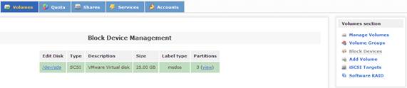 當(dāng)配置好系統(tǒng)的安全訪問控制后,接下來(lái)的一步是配置系統(tǒng)磁盤,實(shí)現(xiàn)虛擬存儲(chǔ)服務(wù)。在 Openfiler 中,有三類存儲(chǔ)概念:Block Device,Physical Volume 和 Volume Group。其中,Block Device 表示的是實(shí)際的物理磁盤;Physical Volume 表示的是物理磁盤的分區(qū),它是組成 Volume Group 的單元;Volume Group 則是由一個(gè)或多個(gè)物理磁盤分區(qū)(Physical Volume)組成,它又是組成 Logical Volume 的單元。