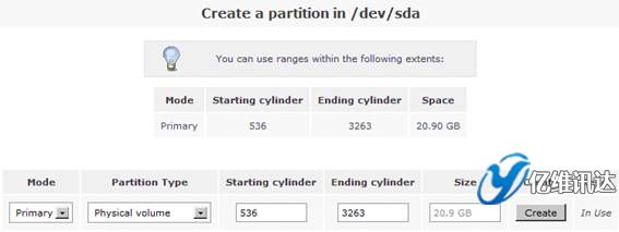在這里,我們要?jiǎng)?chuàng)建一個(gè)新的分區(qū)。首先在“Create a partition in /dev/sda”處設(shè)置“Partition Type”屬性的值為“Physical volume”,在“Ending cylinder”屬性處選擇默認(rèn)值,從而設(shè)置當(dāng)前所有的剩余空間劃為一個(gè)分區(qū),最后點(diǎn)擊“Create”選項(xiàng)。如圖