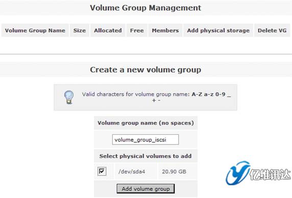 接著在右側(cè)的“Volumes section”區(qū)域選擇“Volume Groups”來(lái)創(chuàng)建一個(gè)卷組。在區(qū)域“Create a new volume group”處填寫卷組 volume group 的名稱為“volume_group_iscsi”,同時(shí)勾選剛剛在上一步所創(chuàng)建的物理卷 /dev/sda4,最后點(diǎn)擊“Add volume group”。如圖