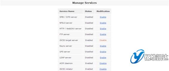 當(dāng) iSCSI 卷創(chuàng)建完成后,接下來(lái)是開啟“iSCSI target server”系統(tǒng)服務(wù)。點(diǎn)擊“Services”菜單,在右側(cè)的“Services section”區(qū)域選擇“Manage Services”。然后將系統(tǒng)服務(wù)列表中的“iSCSI target server”設(shè)置為“Enabled”狀態(tài),從而使得系統(tǒng)能夠?qū)ν馓峁┗?iSCSI 協(xié)議的虛擬存儲(chǔ)服務(wù)。如圖