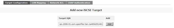 接下來(lái)是添加一個(gè) iSCSI Target。首先點(diǎn)擊菜單“Volumes”,然后在右側(cè)的“Volumes section”區(qū)域中選擇“iSCSI Targets”。在“Target Configuration”子菜單中的“Add new iSCSI Target”區(qū)域,選擇列出的“Target IQN”。最后點(diǎn)擊“Add”按鈕,從而添加了一個(gè) iSCSI Target。注意,此處的 Target IQN 信息在后面的對(duì) ESX 服務(wù)器的存儲(chǔ)配置過程中會(huì)用到。如圖