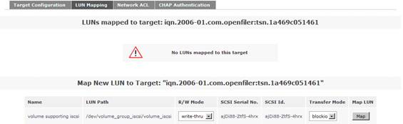 接下來(lái)點(diǎn)擊“LUN Mapping”子菜單,保持其余默認(rèn)選項(xiàng),點(diǎn)擊“Map”選項(xiàng)。從而實(shí)現(xiàn)從 LUN 到剛剛配置好的 iSCSI Target 之間的映射。如圖