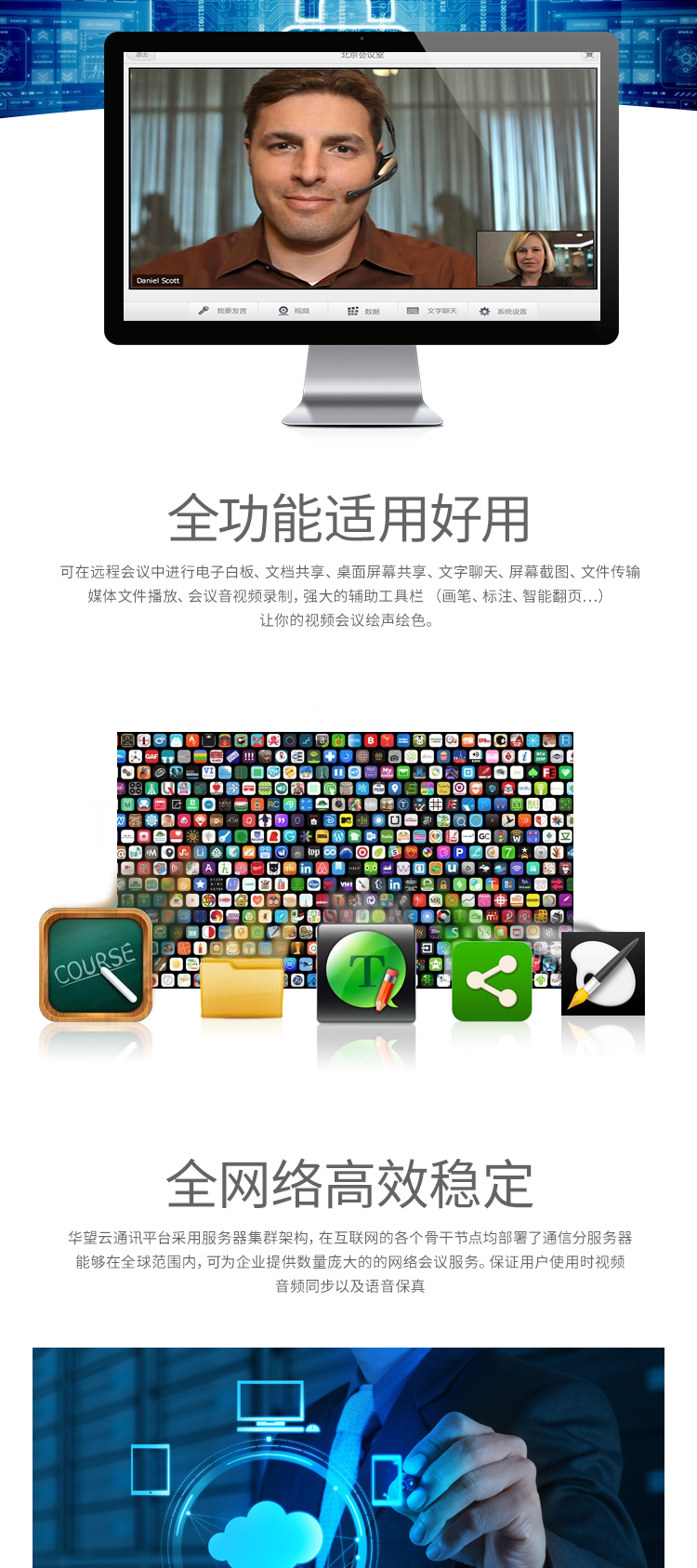 產(chǎn)品特性:最穩(wěn)定的音視頻通訊云平臺,能為用戶提供包括語音、視頻、文檔、影音、