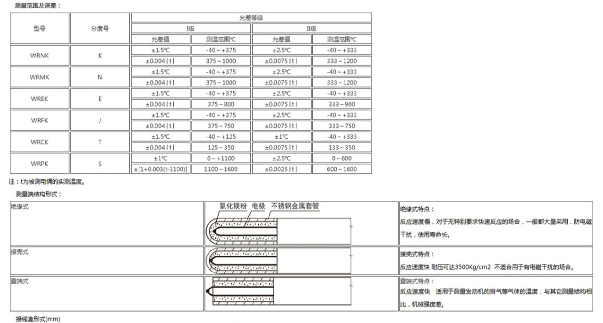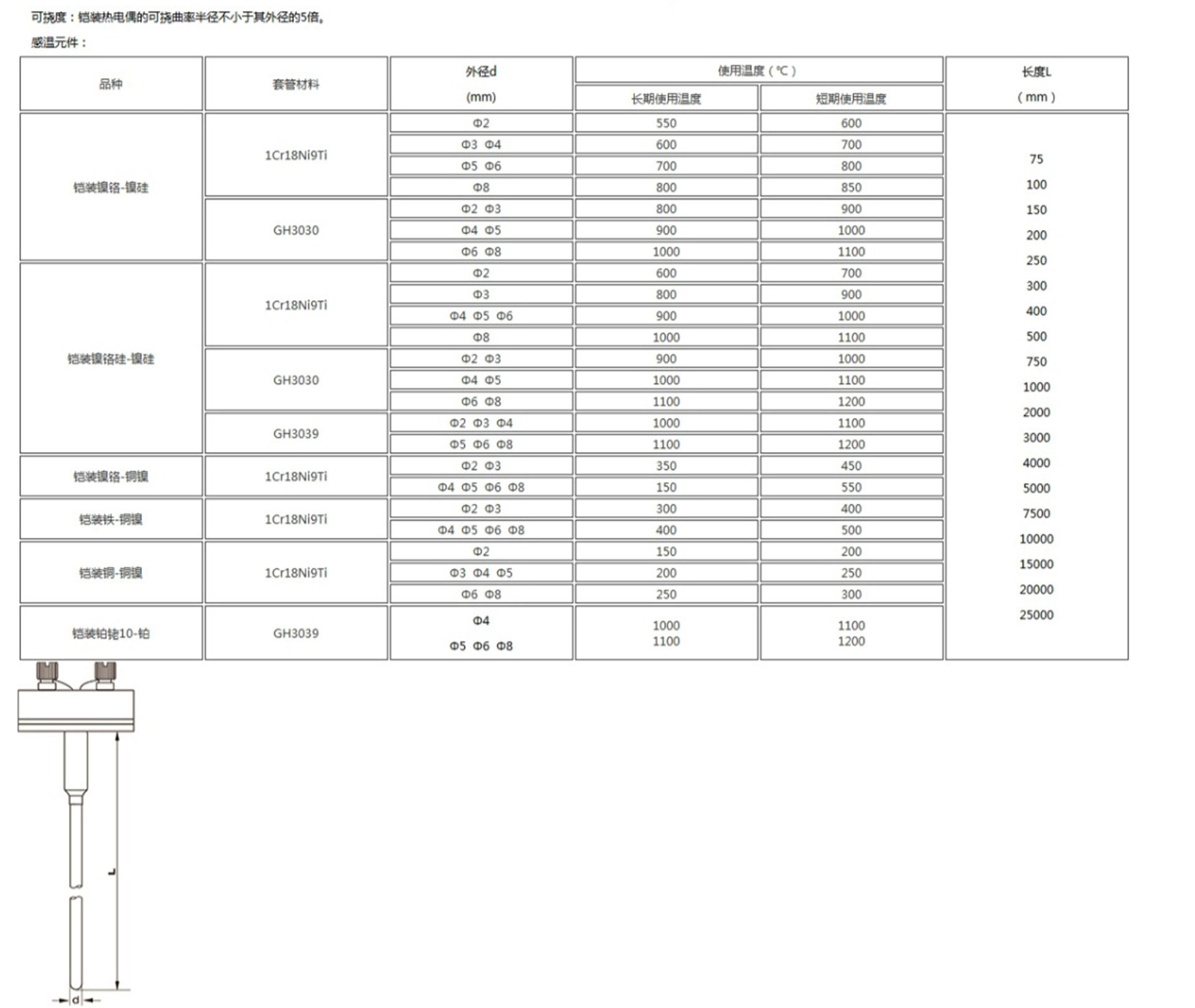 鎧裝熱電偶作為溫度測量傳感器,通常與溫度變送器、調節(jié)器及顯示儀表等配套使用,組成過程控制系統,用以直接測量或控制各種生產過程中0-1800℃范圍內的流體、蒸汽和氣體介質以及固體表面等溫度。鎧狀熱電偶具有能彎曲、耐高壓、熱響應時間快和堅固耐用等許多優(yōu)點。